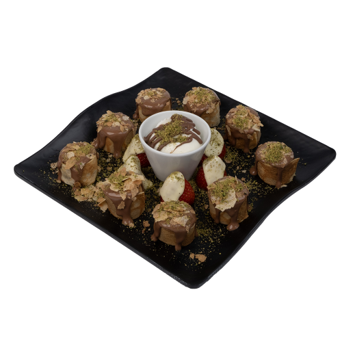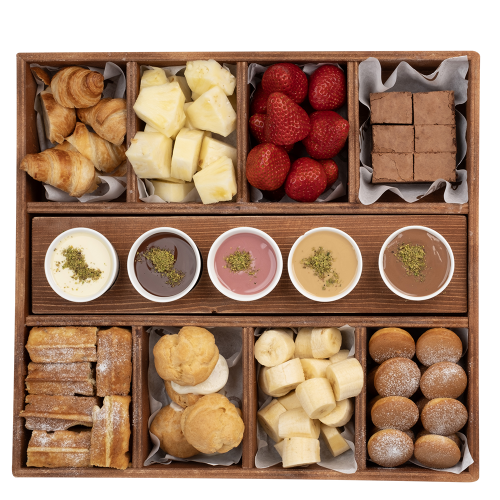 Pankek, krep, waffle parçaları, kruvasan, mini profiterol, browni, muz, çilek, ananas ve beş farklı çikolata