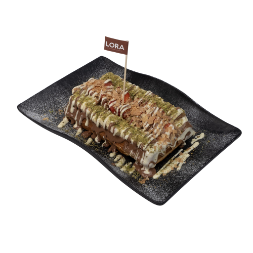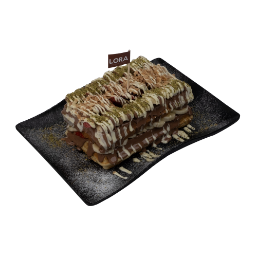 İki waffle arasına bol çikolata, muz, çilek ve krep kırığı eklenir. Üzerine tekrar çikolata, muz, çilek, krep kırığı ve antep fıstığı parçaları eklenerek servis edilir. Dilerseniz ekstralar bölümden ekleme yapabilirsiniz.