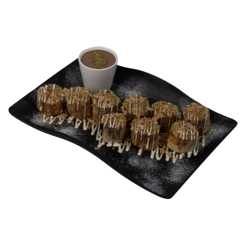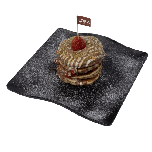 Mini pankeklerin arasına muz ve çilek konulur. Üzerine sütlü çikolata dökülür. Krep kırığı ve Antep fıstık serpiştirilerek servis edilir.