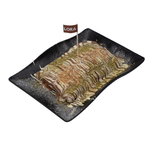 Büyük pankekler arasında çikolata sürülür. Arasına muz ve çilek konulur. Üzerine krep kırığı ve Antep fıstığı parçaları dökülerek servis edilir.