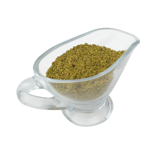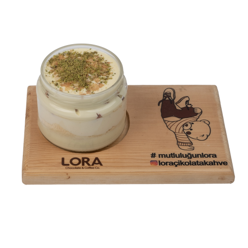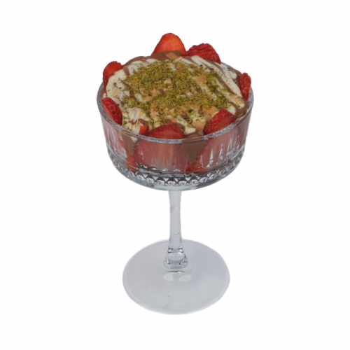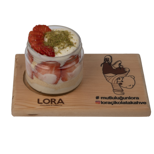 Bardak içerisine bebe bisküvisi, Çilek, Beyaz sütlü çikolata, üzerine antep fıstığı parçaları serpiştirilerek servis edilir.