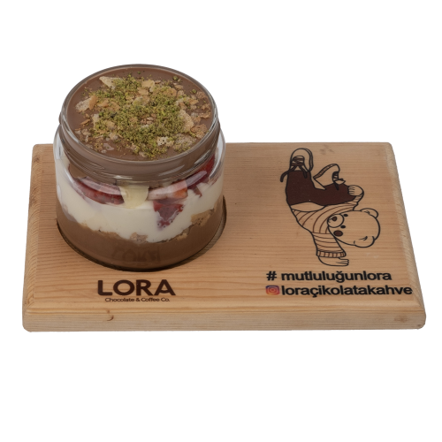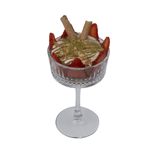 Bardak içerisine Rulo Kat, Muz, Çilek, Çıtır Krep kırıkları ve Belçika sütlü çikolata ile servis edilir.