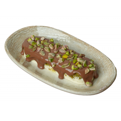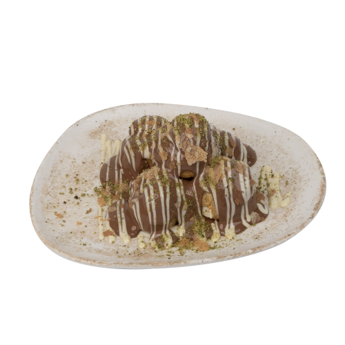 Çikolata, muz, çilek, krep kırığı ve antep fıstığı parçaları ile servis edilir. Dilerseniz ekstralar bölümden ekleme yapabilirsiniz.