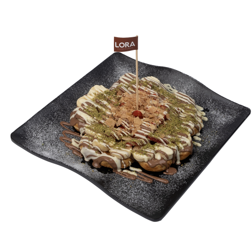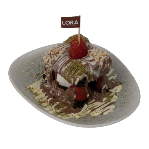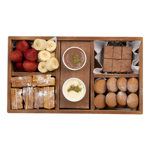 Pankek, waffle parçaları, browni, muz, çilek, sütlü ve beyaz çikolata
