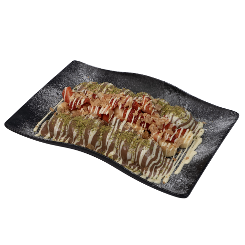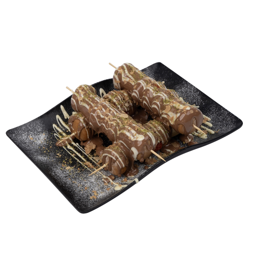 Pankek, muz ve çilek çubuğuna dizilir. Üzerine çikolata, krep kırığı ve antep fıstığı parçaları dökülerek servis edilir.