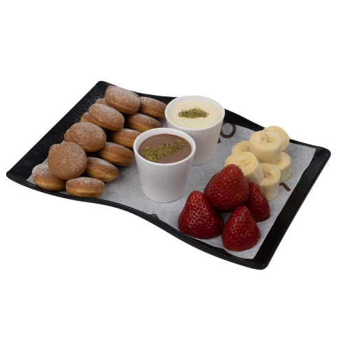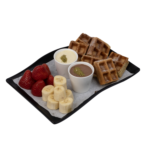 Mini waffle parçaları, muz, çilek, sütlü ve beyaz çikolata ile servis edilir.
